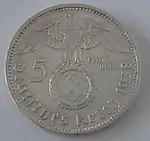 5 марок | 29 мм | 13,889/12,5 | GEMEINNUTZ GEHT VOR EIGENNUTZ (укр. Загальне благо понад власного блага) | 0,900 Ag, 0,100 Cu | 1934—1935 | Загалом[36] — 70 000 000[37] | 26.08.1941 |