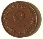 2 пфенніга | 20 | 3,333 | гладкий | 0,950 Cu, 0,04 Sn, 0,01 Zn | 1936 | Заголом[5] — 13 417 795 | 01.03.1942 | |