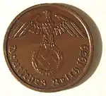 5 пфеннигів | 18 | 2,5 | 84 насічки | 0,915 Cu, 0,085 Al | 1936—1939 | Загалом[18] — 233 756 944[19] | Саар — 15.01.1948 ФРН — 1.09.1948 Західний Берлін — 20.03.1949 НДР — 03.04.1949 Австрія — 01.10.1950 |