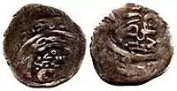 - 2) Дирхам. 1279 (677 р.Г.) рік. В лінійному та крапковому колах легенда великими літерами у 2 рядки. Внизу більш дрібними літерами позначення монетного двору. Зліва віньєтка. На реверсі в круглому картуші Г-подібна тамга. Вгорі та внизу позначення монетного двору. По колу монети надпис. Існує різновид з надписами в картушу[3].