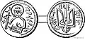 Монограма, тризуб, на монеті князя Володимира Святославича.