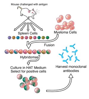 На першому етапі лабораторним мишам проводиться імунізація шляхом ввення антигену, антитіла до якого мають виробляти клітини імунної системи миші. Після проведення циклу імунізації, який триває кілька тижнів, перевіряють, чи в мишей розвинулась імунна відповідь. Якщо імунна відповідь відбулась, то в тварин вилучають селезінку, промивають та подрібнюють її, отримані клітини селезінки змішують із суспензією спеціальних мієломних клітин, і цю суміш початково інкубують у 35 % розчині поліетиленгліколю, а пізніше переносять у середовище, у якому містяться гіпоксантин, аміноптерин та тимідин, оскільки в такому середовищі ростуть виключно клітини-гібридоми мієломи-селезінки. Після отримання гібридом їх на 10—14 день переносять із вказаного вище середовища до лунок пластикових планшетів, на якому їх далі вирощують на звичайному культуральному середовищі без додавання аміноптерину, тимідину і гіпоксантину. Після цього проводиться ідентифікація гібридних клітинних ліній, які виробляють специфічні антитіла шляхом імуноферментного аналізу. При отриманні клітин, які продукують необхідні антитіла, їх висівають із лунок на культуральне середовище, культивуючи їх у інші лунки, і шляхом клонування їх виробляють у кількості, достатній і для промислового виробництва. Іноді гібридоми культивують в організми мишей, вводячи їх у черевну порожнину тварини, і після того, як вони приживуться та розпочинають розмножуватися, їх отримують у великих кількостях із асцитичної рідини. Деякі моноклональні антитіла отримують у системі для експресії, яка створена на основі клітин яєчників китайського хом'ячка.[4]