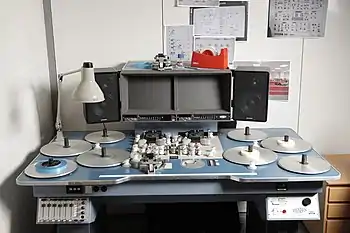 Звукомонтажний стіл — комбінація звукомонтажного апарату і монтажного столу, призначена для одночасного монтажу і синхронізації різних кіноплівок з зображенням і оптичною фонограмою[6]. На відміну від звичайного монтажного столу, із одним стрічкопротяжним механізмом, звукомонтажні мають два (двоактові столи), які можуть працювати як синхронно, так і незалежно один від одного[1]. Сучасні столи можуть працювати також з магнітною та оптичною фонограмою на 35 або 16-мм перфорованій стрічці, а також з цифровими фонограмами[7]. Для роботи з двома фонограмами використовуються трьохактні столи, а для роботи з двома фонограмами і двома кіноплівками із зображенням багатокамерної зйомки — чотириактні[8].