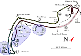 - 1 Sainte Devote — поворот названо в честь церкви, що знаходиться поряд з трасою