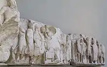 Нижній фриз постаменту був складений з 22 мармурових блоків вкритих рельєфними зображеннями, з яких сім були втрачені або збереглися фрагментарно. Збережені рельєфи зображають героїчні батальні сцени, без чіткого сюжету. На них зображаені солдати, одягнені в грецькі костюми та обладунки.