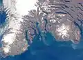Південна частина островів Кергелен, праворуч знаходиться Монт Росс (біла пляма), а зліва - льодовик Кука (біла пляма) та півострів Ральє дю Баті.