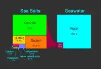 Середній вміст солей у морській воді близько 35 ‰, температура замерзання 1,91 °С, густина 1020 кг/м³. Хімічний склад морської води постійний — 99,99 % за масою сольового складу припадає на Na+ — 10,7 ‰, K+ — 0,39 ‰, Ca2+ — 0,42 ‰, Mg2+ — 1,30 ‰, SO42− — 2,70 ‰, Cl− — 19,35 ‰, Br− — 0,06 ‰, CO32− — 0,07 ‰. При цьому 85 % солей у морській воді складає NaCl, у значних кількостях присутні: MgCl2, MgSO4, CaSO4, NaBr, а також розчинені гази та органічні речовини (1-5 мг/л).