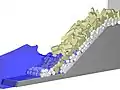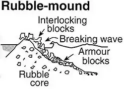 - Насипні дамби — використовуються для ситуацій з меншою енергією хвиль і ерозійного впливу, в деяких випадках не забезпечують гідроізоляції і дозволяють прохід води після руйнування хвилі.[10]