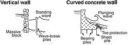- Вертикальні дамби — відбивають енергію хвиль і за штормових умов призводять до утворення стоячих хвиль, вертикальність поверхні, яка сприймає зовнішній тиск, може стати причиною руйнування дамб цього виду;[9]
