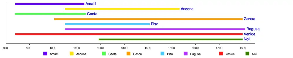 Історія окремих морських республік досить різноманітна, також дуже різна тривалість їх існування. Венеція, Генуя, Нолі та Рагуза прожили дуже довге життя, з незалежністю, яка пережила середньовічний період і тривала аж до порогу сучасної епохи, коли італійські та європейські держави були зруйновані та спустошені наполеонівськими війнами. Піза і Анкона зберігали свою незалежність лише до епохи Відродження — Піза потрапила під панування Республіки Флоренція в 1406 р., тоді як Анкона потрапила під контроль Папської держави в 1532 р.[2] Водночас Амальфі і Гаета втратили свою незалежність ще за часів центрального середньовіччя — перша в 1131 році, а друга в 1140 році, обидві внаслідок норманського завоювання Південної Італії.