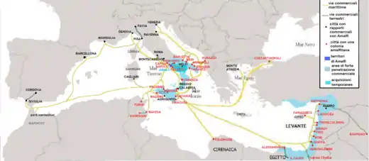 Амальфі була першою морською республікою, що почала відігравати важливу роль в середземноморській торгівлі і розвинула активні комерційні зв'язки з Візантією та Єгиптом. Амальфійські купці зруйнували арабську монополію на середземноморську торгівлю і ще в Х столітті заснували торгові бази в Південній Італії та на Близькому Сході. Амальфійці також першими заснували торгову колонію в Константинополі.