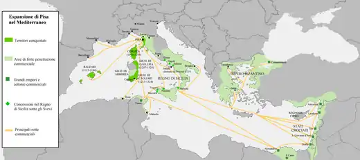 Піза, що на той час ще розташовувалась біля морського узбережжя в гирлі Арно, досягла вершини своєї слави між XII і XIII століттями, коли її кораблі контролювали Західне Середземномор'я. У XIII столітті суперництво між Пізою та Генуєю зростало і врешті призвело до морської битви при Мелорії (1284), яка закінчилась розгромом пізанського флоту і ознаменувала початок занепаду Пізанської республіки. Піза відмовилася від усіх претензій на Корсику і передала Генуї в 1299 році свою частину Сардинії. Крім того, розпочате в 1324 році Арагонське завоювання Сардинії позбавили тосканське місто від контролю над юдикатами в Кальярі і Галлурі. Проте Піза все ще зберігала свою незалежність і контроль над тосканським узбережжям до 1409 року, коли вона була анексована Флоренцією.