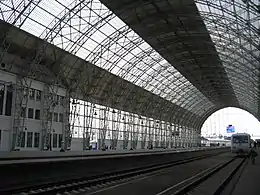 До будівлі вокзалу примикає дебаркадер: простір над платформами перекриває величезне засклене аркова покриття (довжина 321 м, ширина прольоту 47,9 м, висота 28 м, вага конструкцій понад 1250 т), що має форму параболи. Стальні високі тришарнірні аркові ферми прекрасно видно і демонструють витонченість величного споруди.