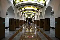 Підлога складається з бетонних конструкцій. Плафони знаходяться в поглибленнях арочної стелі. Замість стандартних колон на станції виконані арочні проходи, платформова частина перекрита типовими залізобетонними блоками, а центральний зал має склепінчасте бетонне перекриття. На невисокі колони, оздоблені червоним гранітом, спираються білосніжні арки, що утримують пружне вигнуте склепіння. Під склепінням в отворах між бетонними балками розташовані ажурні металеві прикраси золотистого кольору, за якими встановлені світильники. Колійні стіни оздоблені білим мармуром і облямовані знизу чорним каменем, а зверху — мармуром золотисто-жовтуватого відтінку, перегукуючись із темою оздоблення центрального залу.