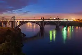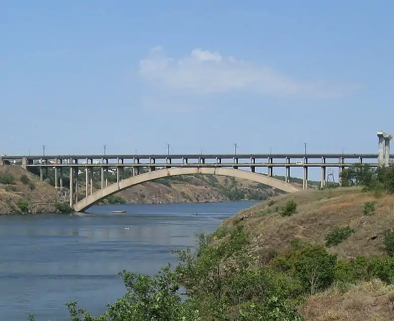 Одноарковий двоярусний міст через старе русло Дніпра. Довжина мосту становить 228 метрів. Міст був найдовшим арковим мостом України до побудови у 1974 році ще одного аркового мосту через Дніпро в Запоріжжі.