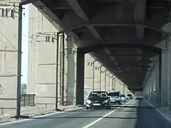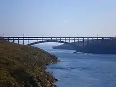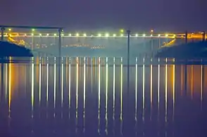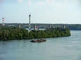 Чотириарковий двоярусний міст через нове русло Дніпра. Довжина мосту становить 560 метрів, висота — 54 метри.