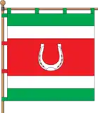 Квадратне полотнище розділене на п'ять горизонтальних смуг — зелену, білу, червону, білу та зелену (1:1:3:1:1), у центрі червоної смуги — біла підкова.