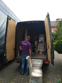 - забирання хатнього майна після упакування до регіонального терміналу невеликими фургонами, потім транспортування від одного регіонального терміналу до іншого на вантажівках великої ємності (наприклад, збірні вантажі, разом з майном інших домовласників), нарешті доставка речей на місце призначення здійснюється знову невеликими фургонами.