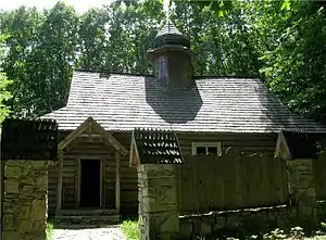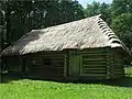 Опілля представлене хатою і дерев'яною церквою із ґанком.