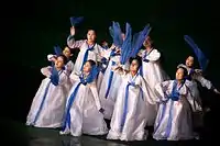Корейська буддійська музична традиція відрізняється від японської та китайської, хоча колишні зразки були запозичені з Китаю. Буддійська музика включає такі мистецтва як читання співучо (дуже важливе в буддійському обряді та наявні два жанри - помпхе та йомбуль), ритуальні танці та виконуючу поза приміщень оркестрову музику[58]. З ритуальних танців збереглись три: Набічхум (나비춤, танець метелика), парачхум (바라춤, танець з тарілками) та попкочхум (법고춤, танець з барабаном); вони виконуються в церемонії Йонсандже[58].