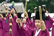 Музичний виступ в святині пращурів (кор. 종묘 제례악, 宗廟祭禮樂, чонмьо-череак) відбувається щорічно в травні. Цей виступ має багато спільного з конфуціанською ритуальною музикою, зокрема, воно виконувалось двома оркестрами, проте набір інструментів відрізняється (додані духові тегим та танпхірі, та ударний панхян)[46].