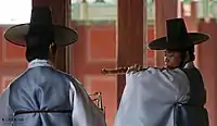 При виконанні військової музики оркестр розділявся на дві частини: в головному процесі йшов більш гучний ансамбль мідно-дерев'яних духових та ударних інструментів течхвітха (кор. 대취타, 大吹打 або кор. 무령지곡, 武寧之曲), а в хвості за ношами, на котрих їхав імператор, - більш тихий чхвітха (кор. 취타. 吹打, також кор. 타령, 槪念, тхарьон), в котрий входили дерев'яні духові, струнні та барабан чхавго (кор. 좌고, 座鼓)[50].