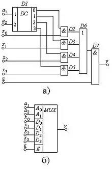 Адресний дешифратор D1, перетворює двійковий код у десятковий для керування роботою мультиплексора. Залежно від комбінації стану адресних входів а1 та а2 на одному з чотирьох виходів дешифратора з'являється одиничний потенціал, який дає дозвіл на спрацьовування відповідної схеми І (D2…D5). Наприклад, при адресному числі 01, коли а1= 1 та а2= 0, на виході 1 дешифратора D1 установлюється рівень логічної одиниці, а на всіх останніх — нульовий. Тому логічний елемент D3 має дозвіл на спрацьовування.