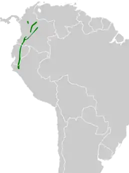 Поширений в Колумбії, Еквадорі та на крайній півночі Перу. Його природні місця проживання — субтропічні або тропічні вологі гірські ліси та сильно деградовані колишні ліси.