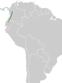 Вид поширений уздовж західного схилу Західних Анд в Колумбії та північно-західному Еквадорі (на південь до Пічинчи). Мешкає у гірських лісах і їхніх узліссях між 1300 і 2350 м над рівнем моря.