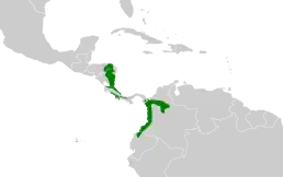 Вид поширений вздовж карибського схилу східного Гондурасу, Нікарагуа, Коста-Рику, Панаму до тихоокеанського схилу західної Колумбії та північно-західного Еквадору. Мешкає в нижньому ярусі та підстилці вологого низинного лісу, на висоті до 1200 м над рівнем моря.