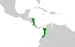 Вид поширений в Коста-Риці, Гондурасі, Нікарагуа, Панамі та на заході Колумбії. Його природні місця проживання — субтропічні або тропічні вологі низовинні ліси та сильно деградовані колишні ліси.