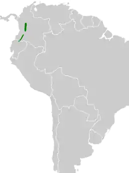 Вид поширений на обох схилах Центральних Анд в Колумбії і на півеочі Еквадору. Його природне середовище проживання — субтропічні або тропічні вологі гірські ліси.