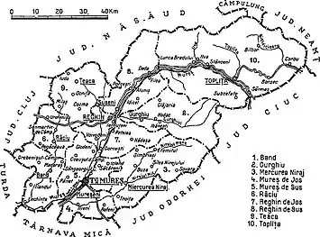 Повіт Мурес спочатку був поділений на сім плас (адміністративна одиниця другого порядку Королівства Румунія), згодом пласи Муреш та Реґін були розділені і кількість плас зросла до 10.