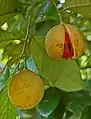 Дерево, 9-12 метрів заввишки, з м'ясистими листками та світло-жовтими ароматними квітами, які зібрані в зонтичні китиці. Плоди завдовжки 6-9 см, жовтого кольору, з м'ясистим навколоплідником, в якому знаходиться велика насінина з гіллястим червонуватим присімянником.