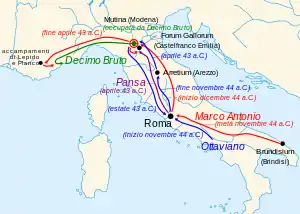 Вбивство Цезаря відновило громадянські війни у Давньому Римі. Приблизно через рік після його смерті, переговори між Марком Антонієм та сенатом провалились. Марк Антоній зібрав свої легіони та відправився на війну проти одного з вбивць Цезаря — Децима Юнія Брута Альбіна, який вже тоді керував Цезальпійською Галією. Децим отримав наказ від Сенату здати провінцію Марку Антонію, але він йому не підкорився. Це була провокація, на яку Антоній поспішив відповісти. У ситуації Антонія, який стояв на краю загибелі, а також був не в пошані серед народу, перемога над Децімом Брутом означала повернення домінуючого положення і встановлення контролю над стратегічно важливою провінцією.
