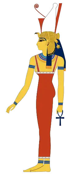 Спочатку вшановувалася як богиня неба, що народила Сонце і що створила світ, про що свідчить епітет Мут — «Велика мати богів». Зображалася у вигляді жінки. Її священною твариною вважалася корова. Храм її знаходився на березі озера Ашеру, поблизу Фів.