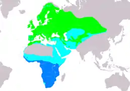 ![]() Ареал поширення M. striata Гніздування Шляхи міграції Зимування | ||||||||||||||||||||