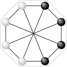 Початок: чорний може починати хід з камінців 1 або 4, білий — з камінців 5 або 8