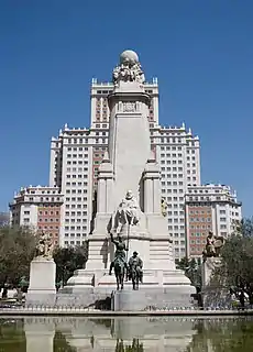 Велетенських розмірів, пафосний монумент Сервантесу встановили також на площі де ла Плаза де Еспанья в Мадриді (скульптор Лоренцо Валера). А надзвичайна висотність монументу письменника підтримана сусідніми хмарочосами площі.