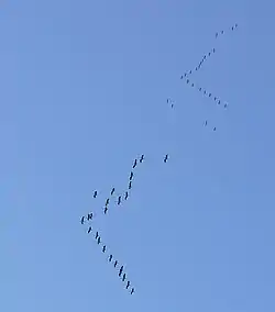 Більшість великих птахів перелітають зграями, що часто формують регулярні розташування птахів, такі як V-подібний «клин» з 12—20 птахів. Таке розташування допомагає птахам зменшити енергетичні витрати на переліт[6]. Наприклад, ісландський (Calidris canutus) і чорногрудий побережники (Calidris alpina), як було визначено за допомогою радарів, летять у зграях на 5 км/год швидше[5].