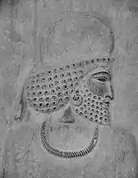 Зала Ападана, 5 століття до н. е. Зображення перських лучників та мідійськиї воїнів у традиційних костюмах (мідійці зображені у круглих шапках та чоботах)
