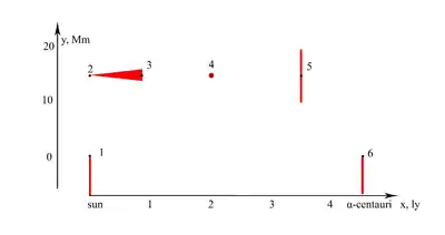 5. Приблизно за світловий рік до цільової зірки розкривається магнітне вітрило. Вітрило використовує міжзоряний газ і сонячний вітер зірки, до якої наближається космічний апарата, для гасіння субсвітлової швидкості з прискоренням спочатку можливо 1,5g. Вітрило збільшує свій радіус в міру падіння швидкості космічного апарата. На заключному етапі магнітного гальмування розмір вітрила досягає десятків тисяч кілометрів.