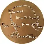 Найбільш відоме рівняння, E = MC2, встановлює фіксоване, кількісне співвідношення між енергією і матерією. Друге рівняння символізує результати дослідження Ейнштейна за законом фотоефекту, за яке він був удостоєний Нобелівської премії з фізики в 1921 році. Третя пов'язана з його роботою з теорії відносності. Його підпис у нижній частині медалі.