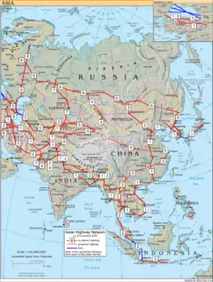 AH1 (20 557 км) Токіо — Осака — Пусан — Сеул — Пхеньян — Шеньян — Пекін — Гонконг — Ханой — Пномпень — Бангкок — Янгон — Мандалай — Дакка — Нью-Делі — Ісламабад — Кабул — Тегеран — Анкара — Стамбул — кордон з Болгарією;
