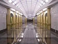Центральний і бічний зали станції освітлюється смугами закарнізних світильників. Підлога оздоблена сірим гранітом, колони обшиті золотистими латунними листами з поручнями такого ж кольору, колійні стіни — білим мармуром.