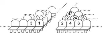 | Аня купила квиток з місцем № 100 у кінопалац, де місця пронумеровані так, як це показано на малюнку: праворуч крісла з парними номерами, ліворуч — з непарними. | ||||