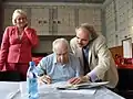 Голова Вінницької обласної ради С.П. Татусяк нагороджує Павла Івановича Муравського пам'ятними подарунками про Вінниччину