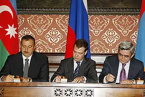 2 листопада 2008 президентами Азербайджану, Вірменії та Росії була підписана декларація, що стосується Карабаського конфлікту. Лідери трьох держав домовилися спільно працювати над оздоровленням ситуації на Кавказі. "Президенти, предметно і змістовно обговоривши стан і перспективи врегулювання нагірно-карабаського конфлікту політичними засобами шляхом продовження прямого діалогу між Азербайджаном і Вірменією за посередництва Росії, США і Франції, заявляють, що сприятимуть оздоровленню ситуації в Південному Кавказі та забезпеченню встановлення в регіоні обстановки стабільності, безпеки шляхом політичного врегулювання конфлікту ", йдеться в декларації.