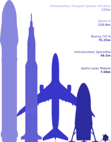 - Нова багаторазова ракета-носій, яка складається з багаторазового прискорювача — Міжпланетного прискорювача — і багаторазового інтегрованого другого ступеня з космічним кораблем, який матиме дві версії: великий довготривалий міжпланетний корабель сумісний зі здатністю транспортування пасажирів або вантажу міжпланетного призначення, і орбітальний заправник ITS.[6][21] Комбінація другого ступеня ракети-носія з міжпланетним космічним кораблем незвичайна для будь-якої відомої космічної місії, її рідко можна побачити у попередніх космічних місіях.