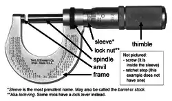 Однією вимірювальною поверхнею є торець мікрометричного гвинта що, висувається із стебла, другий — торець п'яти. Мікрометричний гвинт (зазвичай з кроком рівним 0,5 мм) пов'язаний з корпусом барабана, який має на конусному кінці кругову шкалу. Закінчується барабан різьбою, на яку нагвинчується гайка, що є корпусом механізму тріскачки. Основне призначення тріскачки — забезпечувати сталість вимірювального зусилля за рахунок храповика і підпружиненого стрижня. Мікрометр забезпечений пристроєм, що дозволяє стопорити мікрометричний гвинт та гайкою для регулювання зазору в парі мікрометричних гвинта — гайка.